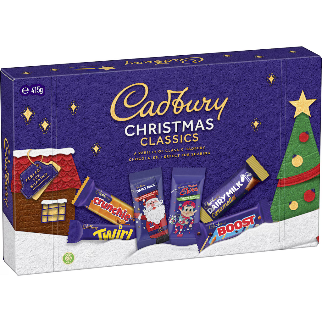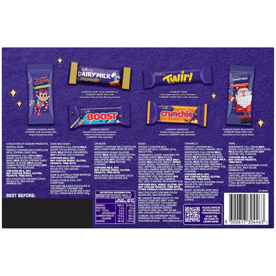 A delicious selection of classic Cadbury treat-sized chocolates that is perfect for sharing and gifting during the Christmas season. Take your pick from Cadbury Dairy Milk milk chocolate Santa, Cadbury Magical Elves, Cadbury Dairy Milk Caramello, Boost, Crunchie, or Twirl.