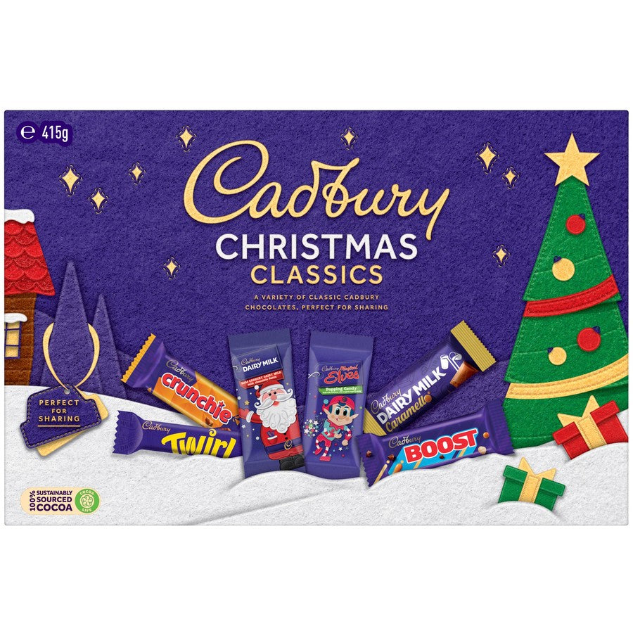 Cadbury Christmas Classics 415g contains a variety of classic Cadbury chocolates, perfect for sharing or giving as a gift at Christmas time.