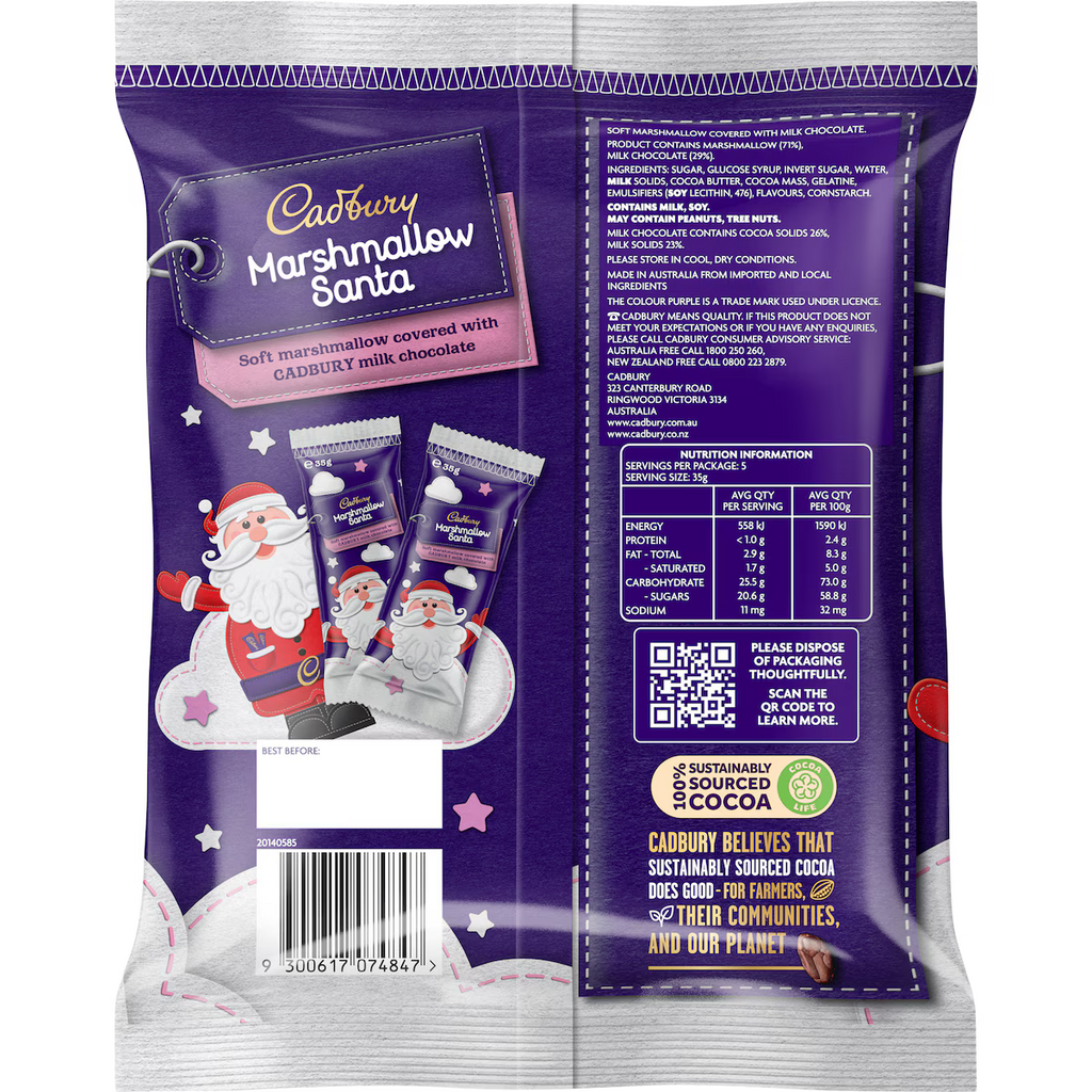 Cadbury Marshmallow Santa share pack contains 5 individually wrapped marshmallow shaped santas covered with milk chocolate.