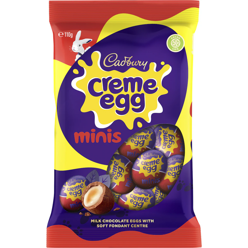 Indulge in the creamy gooey centre of Cadbury Creme Egg Minis this Easter. Delicious Cadbury milk chocolate with a soft fondant centre in a bag perfect for sharing or an indulgent treat.