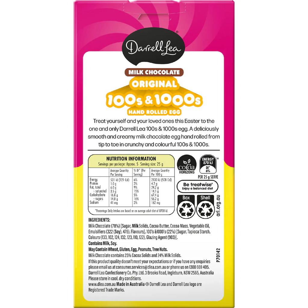 Smoth & creamy Darrell Lea milk chocolate egg, hand rolled in 100's & 1,000's.
