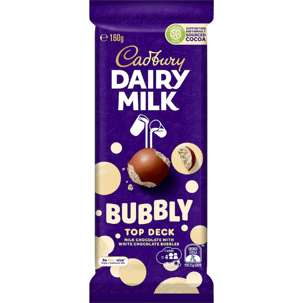 Cadbury Dairy Milk Bubbly Top Deck is a milk chocolate with white chocolate bubbles. Diary Milk milk chocolate with Dream white chocolate bubbles.