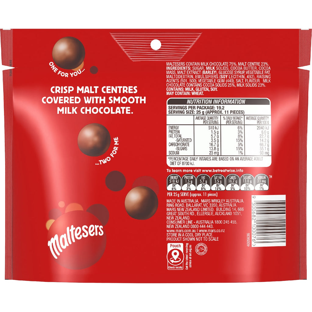 Share the lighter way to enjoy chocolate with the worlds much loved melt-in-the-mouth MALTESERS, featuring crisp malt centres covered with smooth milk chocolate. They're your perfect chocolate snack partners for TV nights and get togethers.